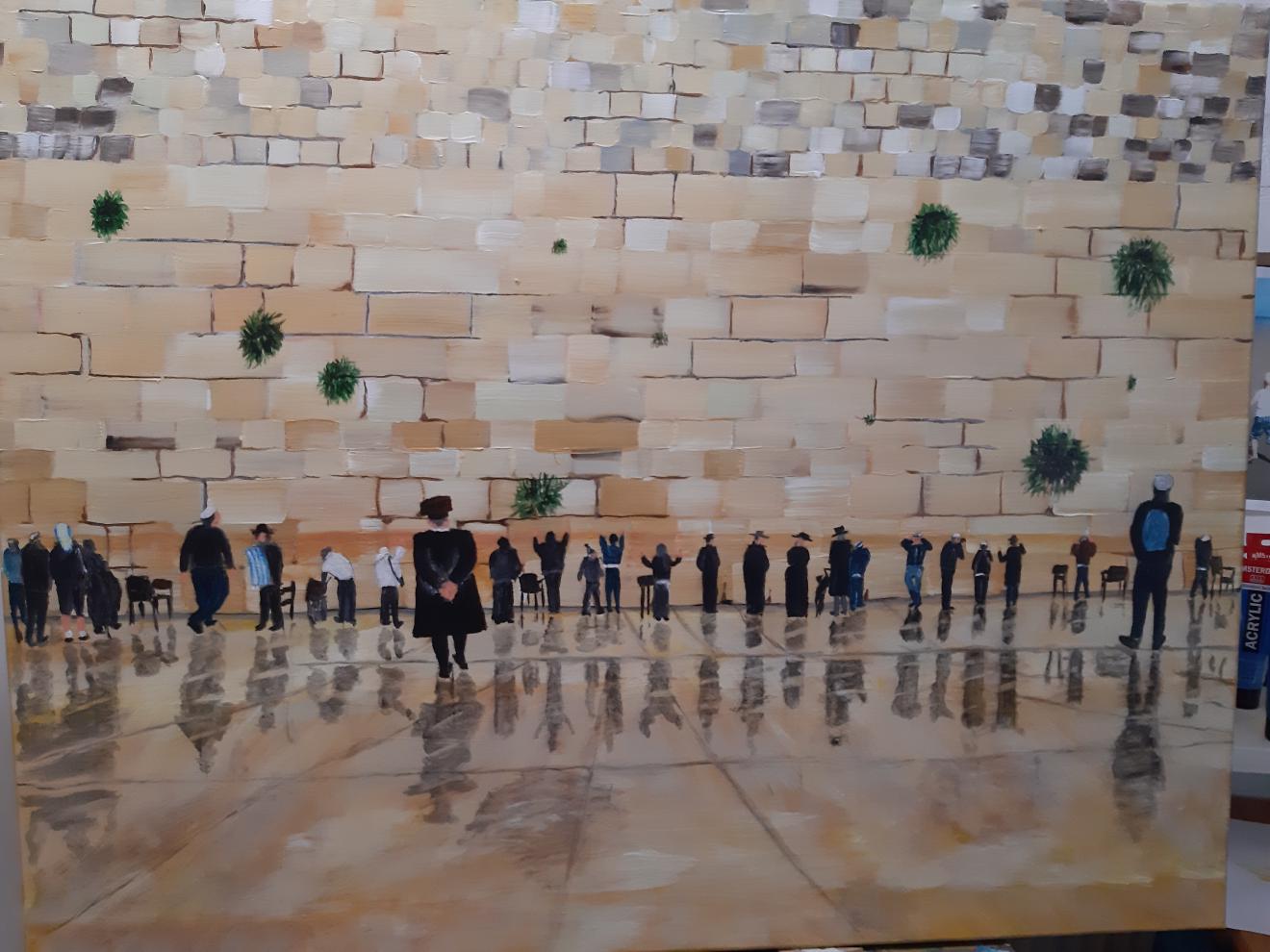 regen en zegen bij de muur Acrylverf op doek (90x70)
