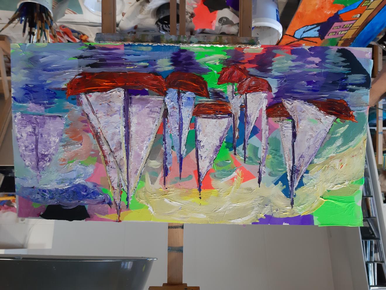 Zeilschepen gemengde techniek op paneel acryl en zijdepapier (35x70)